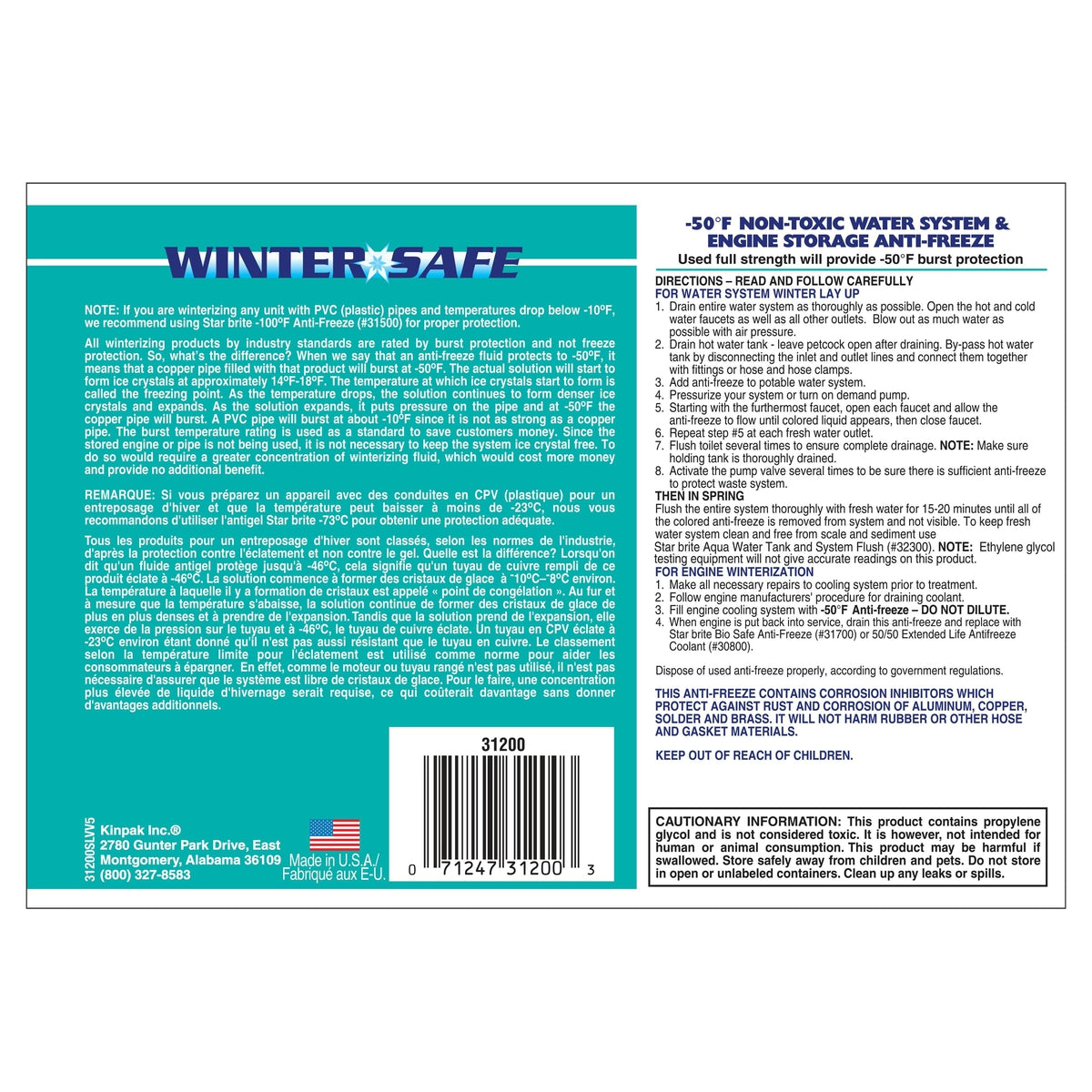 Star brite® Wintersafe -50°F (-46°C) Non-Toxic Antifreeze provides excellent cold weather and corrosion protection for drinking water systems and all engines at an attractive price. Its premium additive package prevents corrosion of aluminum, copper, brass, and solder, but will not harm rubber, seals, or hose materials. The 3X-dyed pink color provides excellent blow-through visibility. Formulated with virgin, non-toxic USP-grade ingredients. It contains no alcohol. This product is ready-to-use; do not dilute it.