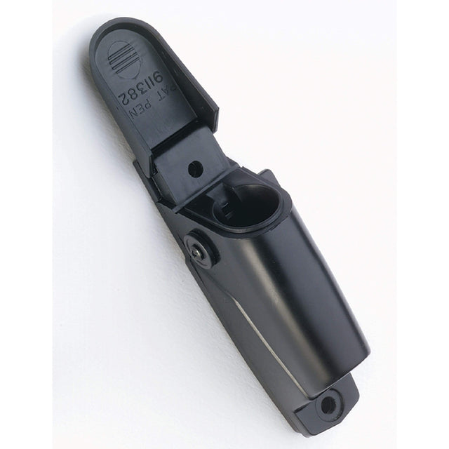 VERTICAL MOUNT WITH PIN CONTACTSCan be mounted on flat windshield frame and includes a V adaptor for mounting on angled windshield frame. Can also be used as a transom mount in open utility boats. black plastic with hinged lid that closes to keep dirt and water out when stowed away. Two holes for number 8 screws. Includes 7 1/2 inch wire leads for connection to 12 VDC power supply