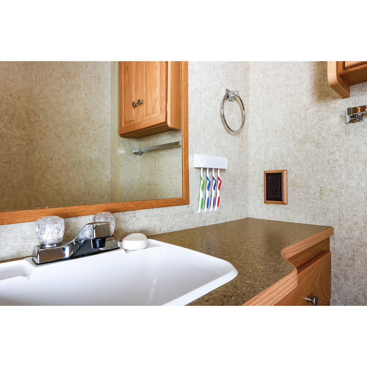 The Camco Pop-A-Toothbrush is a hygienic toothbrush holder designed to mount the wall in our RV bathroom. Fits four toothbrushes, double-sided mounting tape is included. Quick and easy installation.
