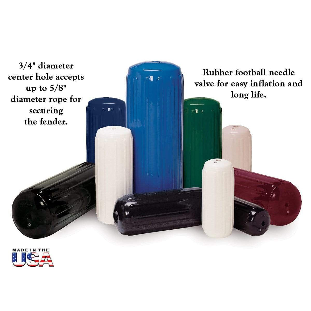 Big B™ Inflatable Vinyl Fender - 12 x 34 For boats 50-60 feet - Hunter GreenThe versatile Big B TMfender incorporates a Center Rope Tube that allows end-to-end line passage. It can be hung vertically or horizontally with a single line. Horizontal hanging is useful protection against pilings, awkward docking situations, and tidal change areas. Big B TMinflatable vinyl fenders feature seamless construction, with molded ribs to minimize roll. Big B?s are made from the highest quality marinegrade vinyl with a high gloss finish. Available in four sizes to fit a full range of boat sizes.