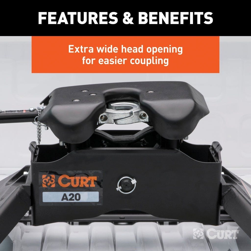 The CURT A20 5th wheel hitch offers smoother, quieter towing for your home-away-from-home, combining the patented technology of our A-series, an easier mounting system, and the power of a 20K 5th wheel hitch. Like our A16 hitch, this 20K 5th wheel hitch uses a patented cast yoke to allow for unimpeded head movement, while providing exceptional stability for the trailer. The yoke has a set of poly-torsion inserts to suppress shock loads and reduce excessive noise, and the head features high-strength, interlocking jaws to give the trailer stability and the freedom to pivot and swivel as needed. The A20 5th wheel hitch is also engineered for easier installation. The legs are equipped with two pins to properly align with the mounting holes, and they have easy-access mounting bolts for ergonomic tightening. The 5th wheel head also has a fast, one-pin removal system to make installation and removal from the truck bed easier. This 20K 5th wheel mounts to any industry-standard 5th wheel rails, using the 5th wheel legs or a CURT 5th wheel roller. It can also be mounted into the puck system of a truck equipped with the towing prep package, using our OEM-compatible legs or roller adapters. Once installed, the A20 is fast and simple to operate. It features an extra-wide head opening to increase the coupling area for the trailer, and it has a lockable, single-throw handle that self-resets to the ready-to-couple position after uncoupling. To make coupling even easier, it is equipped with a coupling indicator that is visible from the truck cab. The indicator shows the status of the connection and eliminates the need for you to check multiple times while coupling. To protect the A20 5th wheel hitch against rust, wear and whatever other threats might impede your cross-country tour, it comes with a black carbide powder coat finish and a limited lifetime warranty. We also test the A20 for safety in accordance with SAE J2638 to ensure reliability for the road ahead.