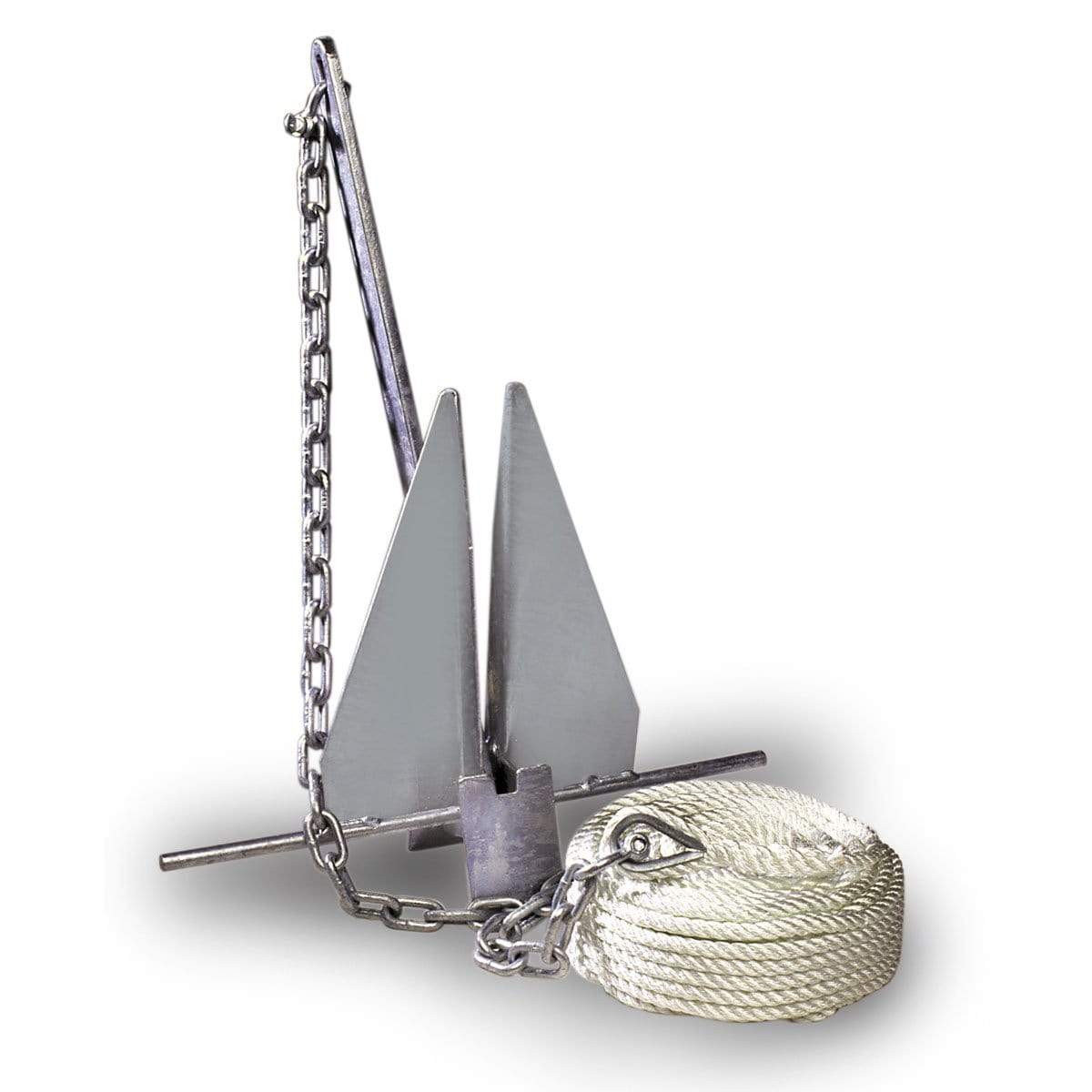 - 1- #8 super hooker anchor, 1 coil of 3/8" x 100' nylon anchor line with thimble, 1 coil of 1/4" x 6' galvanized chain & 2 ea. 5/16" shackles