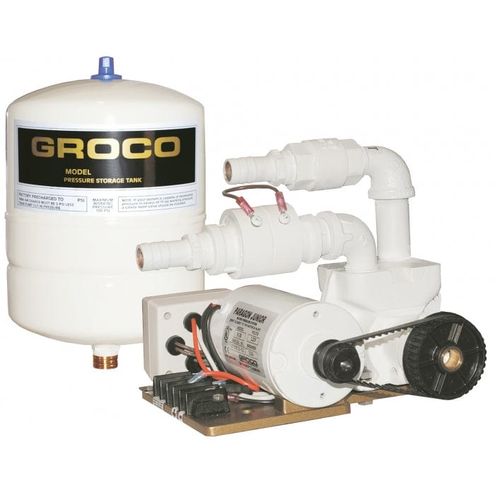 Groco 12 Volt Paragon Junior water pressure system with a 1-gallon pressure storage tank offers a flow rate of 7 gallons per minute and an operating pressure of 20-40 PSI. This system is equipped with a PST-1 pressure storage tank.- 12 Volt DC Operation