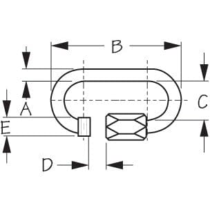 Electrogalvanized steel. Stock is threaded, captive nut screws off one end to open, back on to close. Skin packed. Breaking Strength: 1,100 lb.A: 1/8 in B: 1-7/16 in C: 3/8 in D: 3/16 in E: 3/16 in