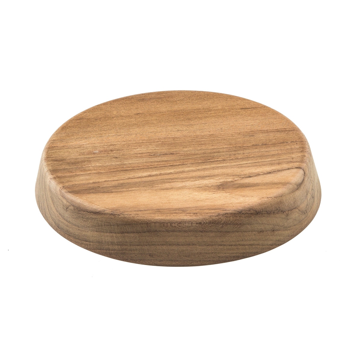 Whitecap's Canted Teak winch pad is made of solid teak construction. Specifications include Diameter (Top): 7-3/4", Diameter (Bottom): 8-3/4", Height: 1-1/2", and angle of 15°. Sturdy, marine durable teak wood.