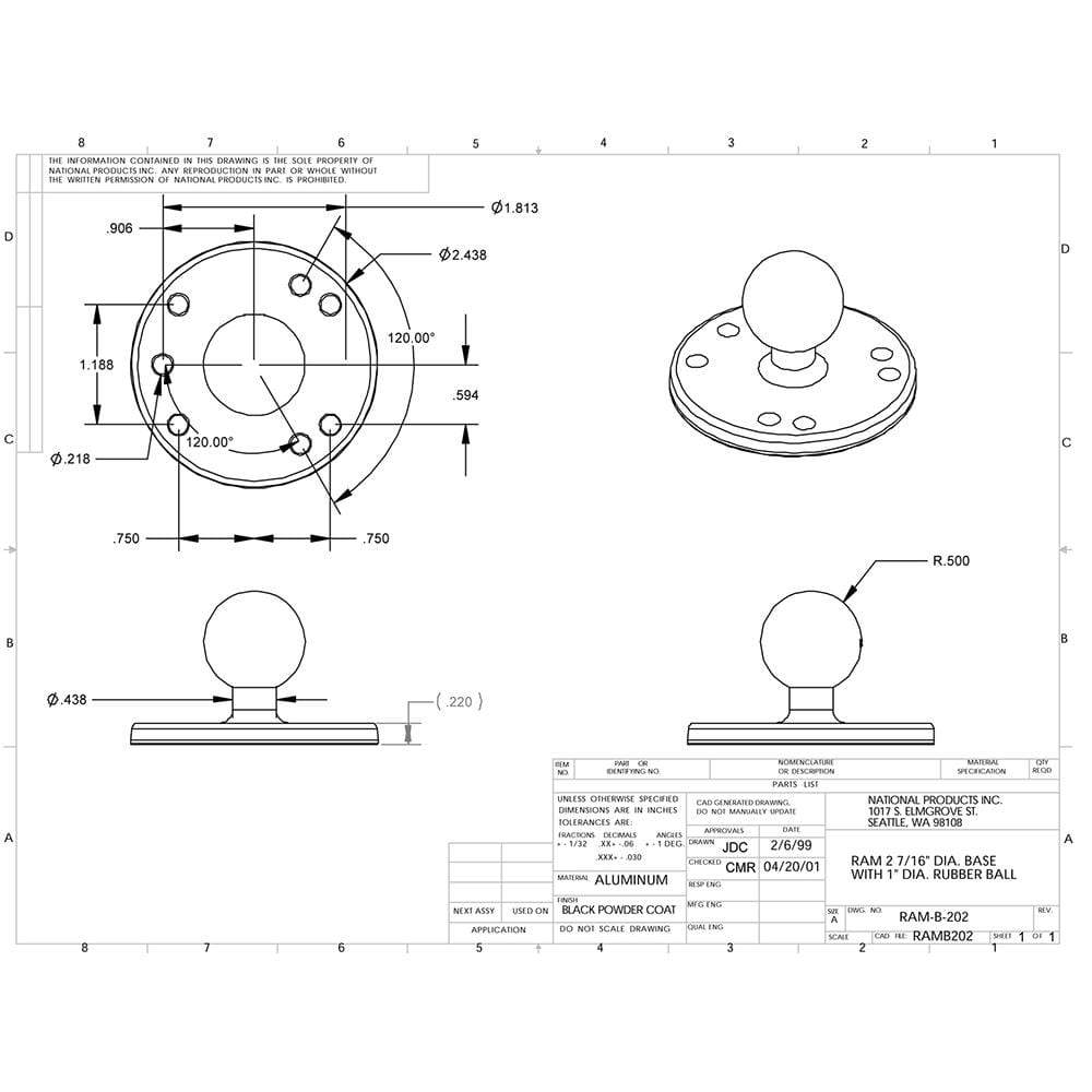 RAM Chrome 2.5" Round Base with the AMPs Hole Pattern & 1" BallThe RAM-B-202CHU, chrome base, consists of a 1" diameter rubber ball connected to a flat 2.5" diameter base. This mount has pre-drilled holes, including the universal AMPS hole pattern.
