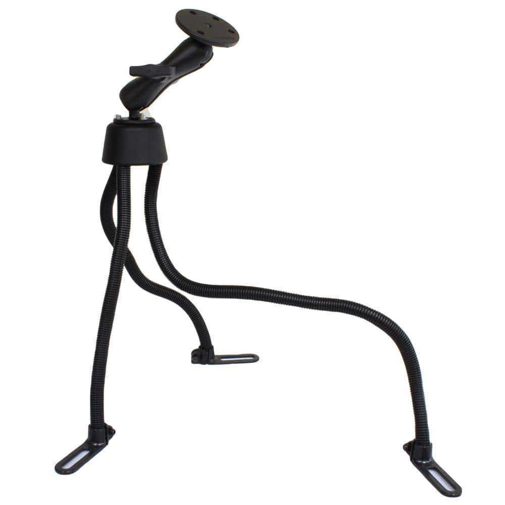 At right angles to the base of two legs are feet with mounting holes. Simply place the holes into the passenger seat mounting bolts and adjust the mount to the required height with the rigid aluminum rod legs. The third leg on the RAM POD III should also be adjusted to help support the mount. The rigid aluminum rod arms will hold everything you need safely and securely.