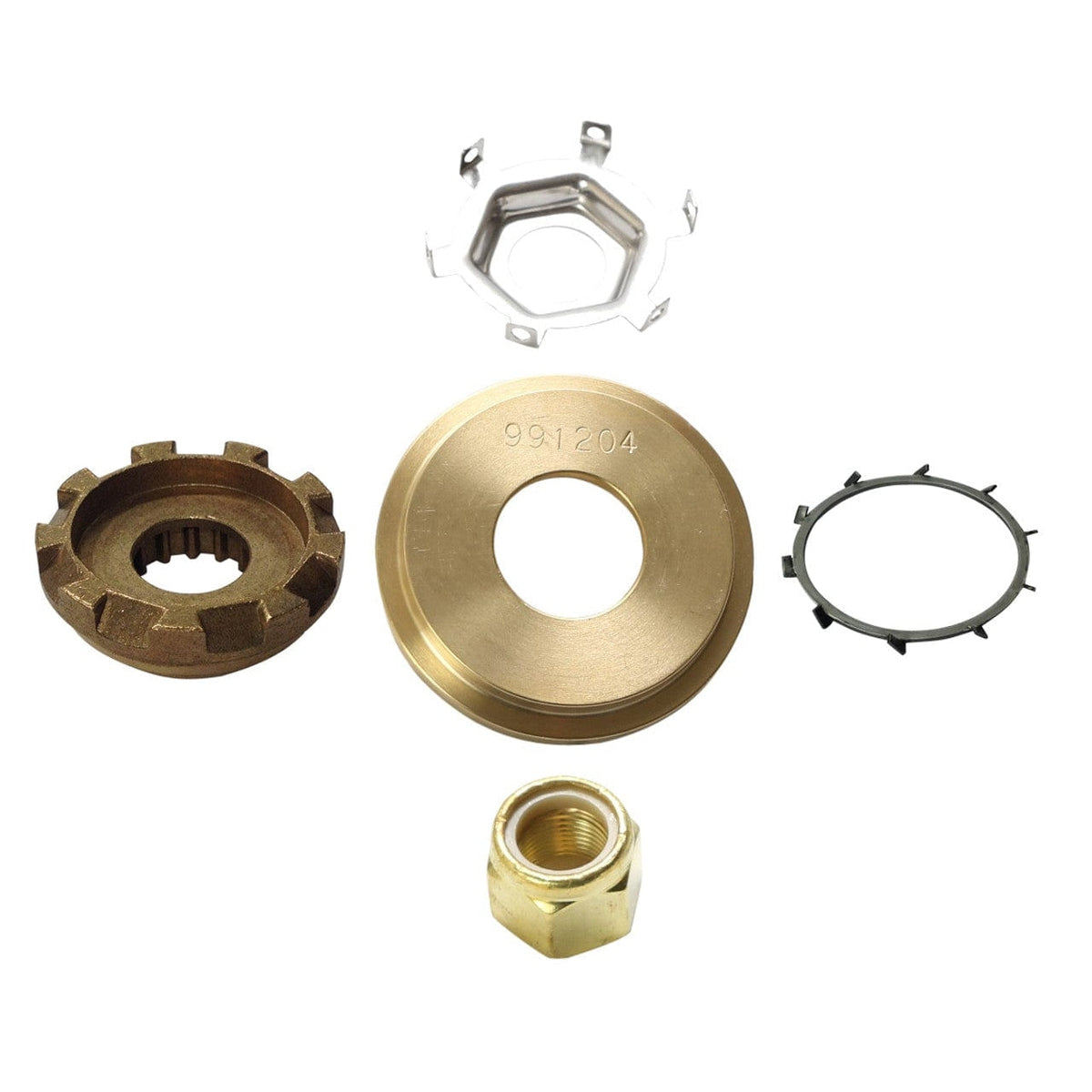 Prop attaching hardware kit V-6 gearcase. Forward thrust washer, Conductivity (star) washer, Aft castle thrust washer, Locking tab washer, and Shaft prop nut.