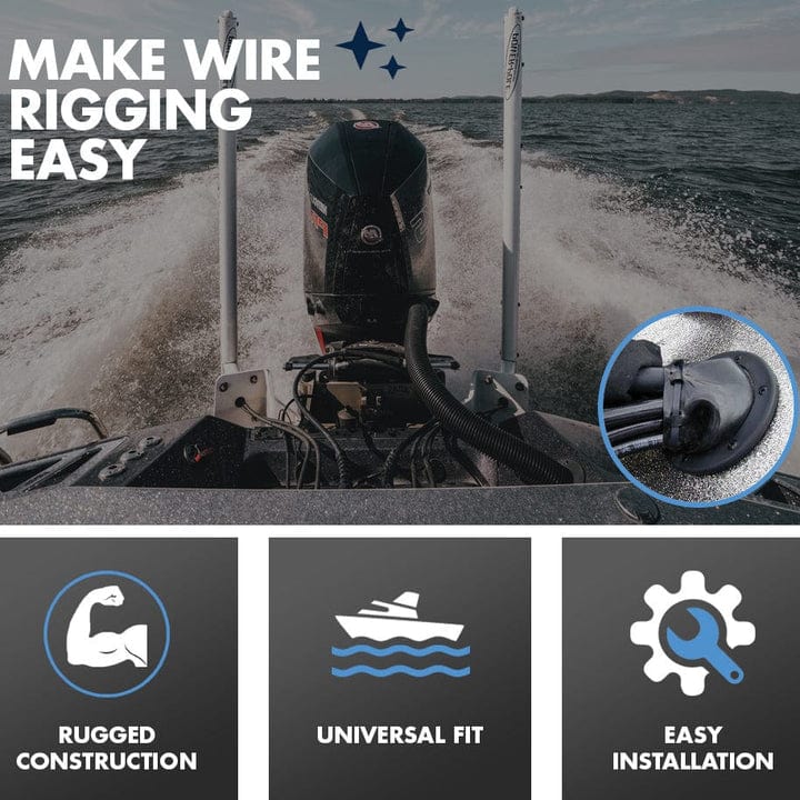 The world's #1 Cable Boot, this patented boot is a truly functional motor well cable boot that is remarkably easy to install. No longer is it necessary to split or cut your motor well boot to pass cables through. This cable boot provides a fully open area to pass wiring and cables through and when rigging is complete simply pull the cable tie snugly around wires and cable to complete installation.