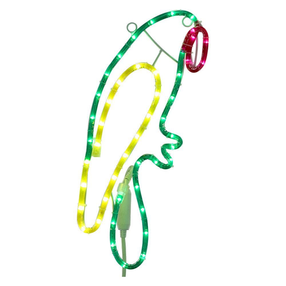 Ming's Mark 8080123 LED Rope Light Parrot features green, yellow, and red rope. This 18" parrot rope light fixture features a metal frame with hanging ring for convenient display. Comes with 4.9' white lead wire.