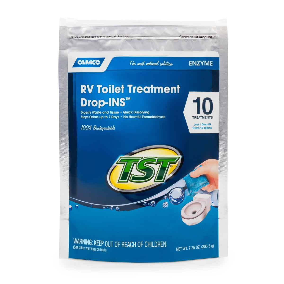Breaks down waste and tissue. Stops odors up to 7 days. No harmful formaldehyde. Septic tank safe. Camco's TST Blue Enzyme RV Toilet Drop-ins contain a bacterial/enzyme complex that will digest waste, tissue, fats and proteins and only activates in the presence of material requiring digestion. Unlike normal enzymes, TST Blue chemistry provides a stable product with a long shelf-life that is not temperature sensitive. Each drop-in treats 40 gallons. It contains a buffer system to prevent acid formation as well as septic odors and has a Pure Rain fragrance. All components are biodegradable.