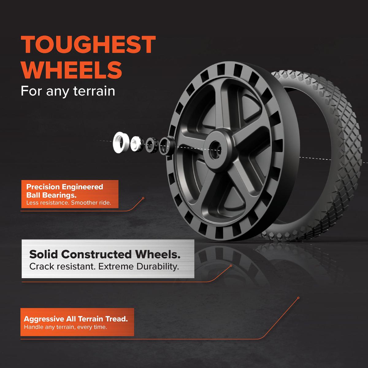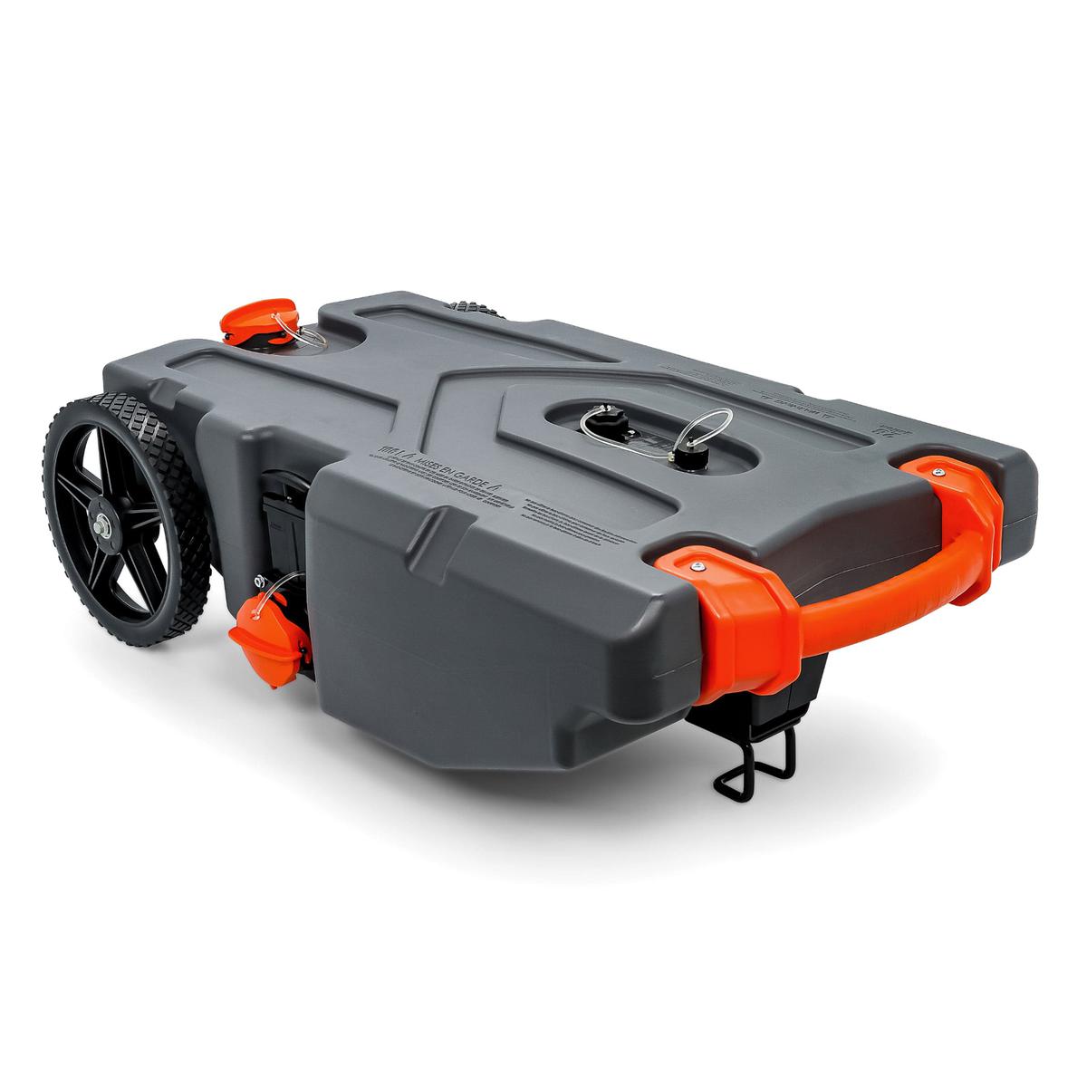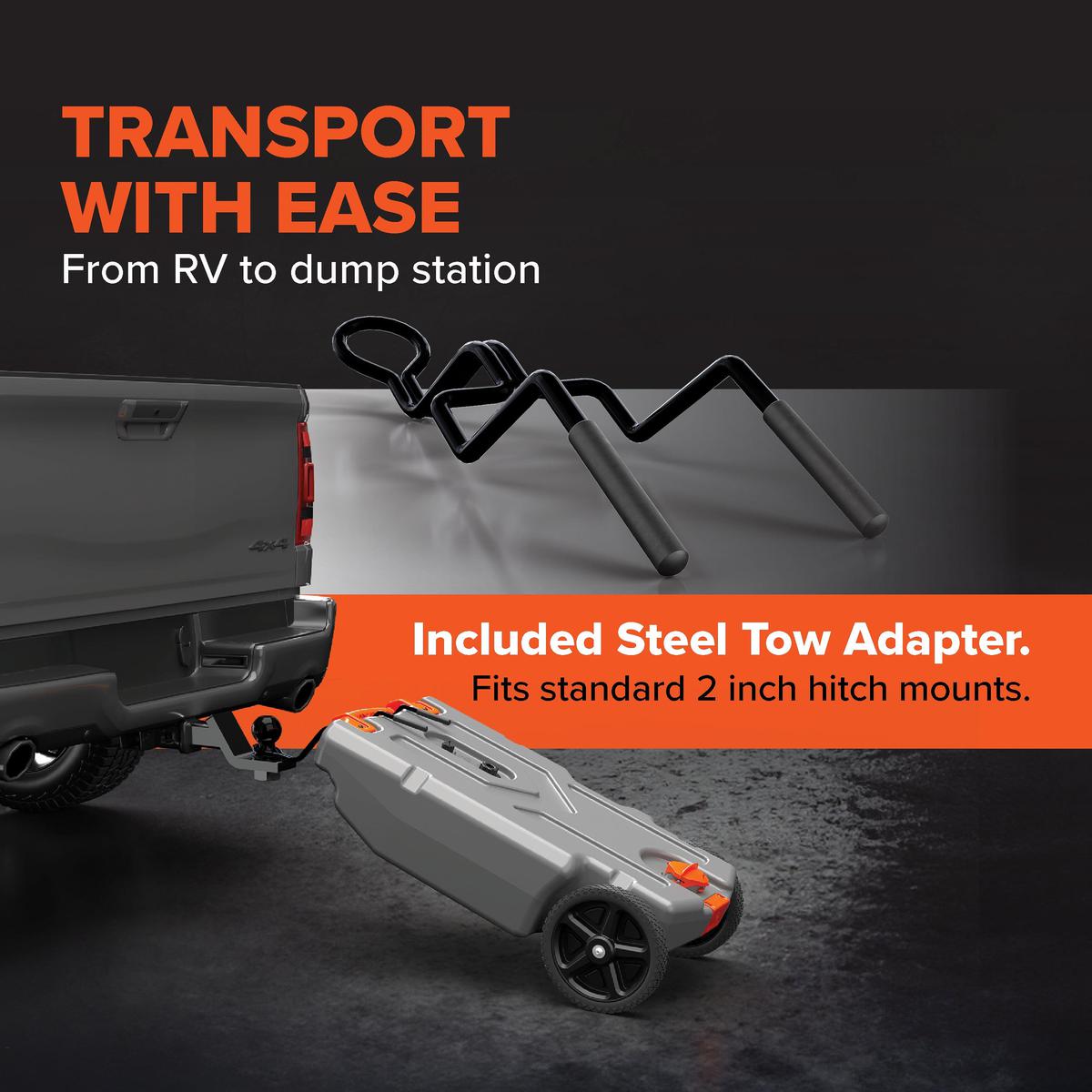 - Large, heavy-duty, no-flat wheels with bearings make transport smooth and easy, and removable steel tow adapter allows you to easily roll the tote tank like a suitcase or tow it slowly behind a golf cart or truck