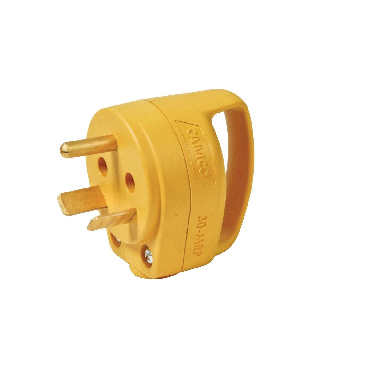 Camco's 30 AMP Mini Replacement Plug fits completely inside your RV's cord cable hatch so the door can be closed during travel. The sturdy Power Grip handle makes it easy to remove the plug from your power outlet. High quality and durable parts.