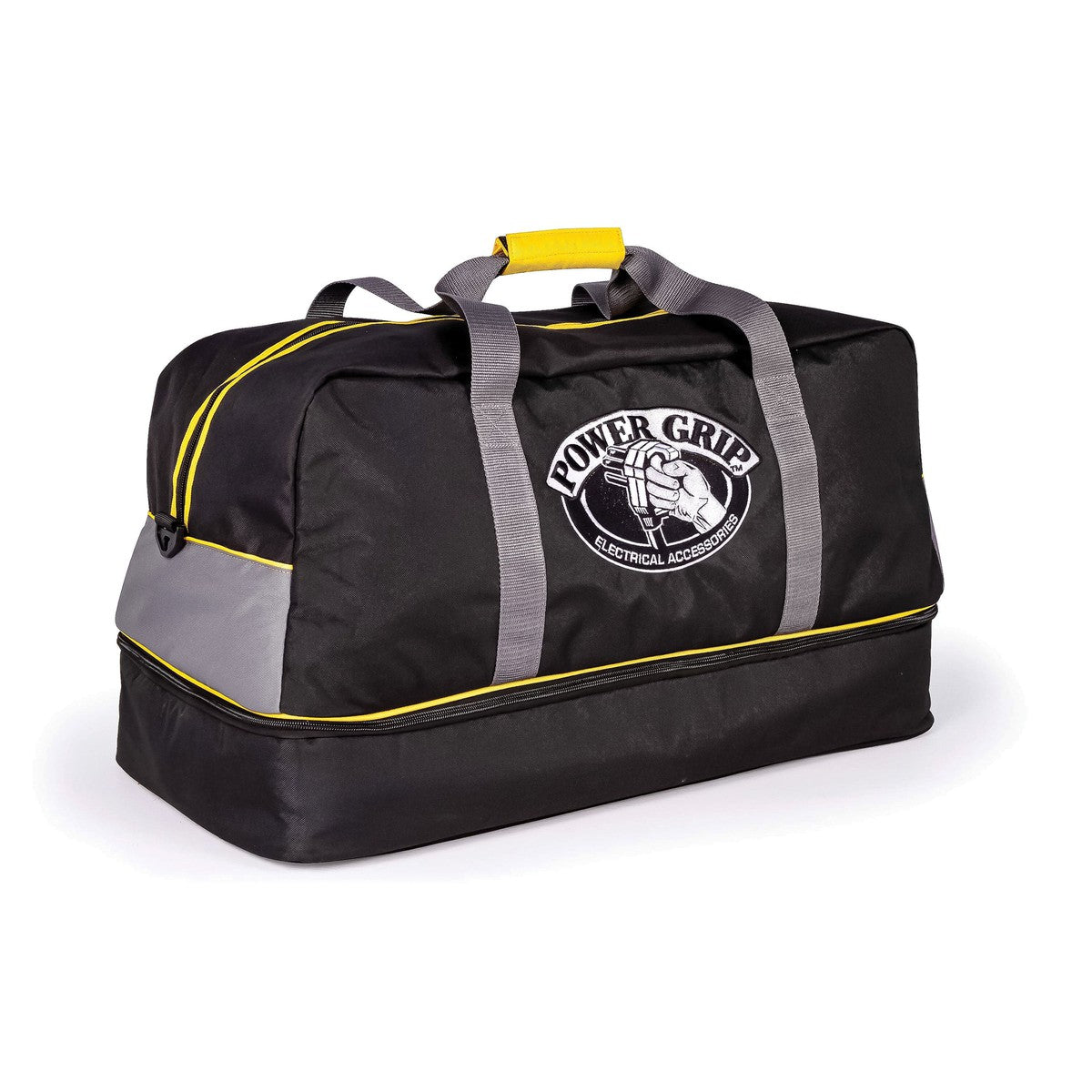 High quality duffel bag stores Power Grip extension cords and accessories. The large main compartment is big enough for a 50-foot extension cord, and the bottom compartment has separate, padded areas to protect accessories. The easy to carry duffel has two handles on the top, or a long, removable shoulder strap that attaches end to end. Duffel is made of heavy duty material and stitching.
