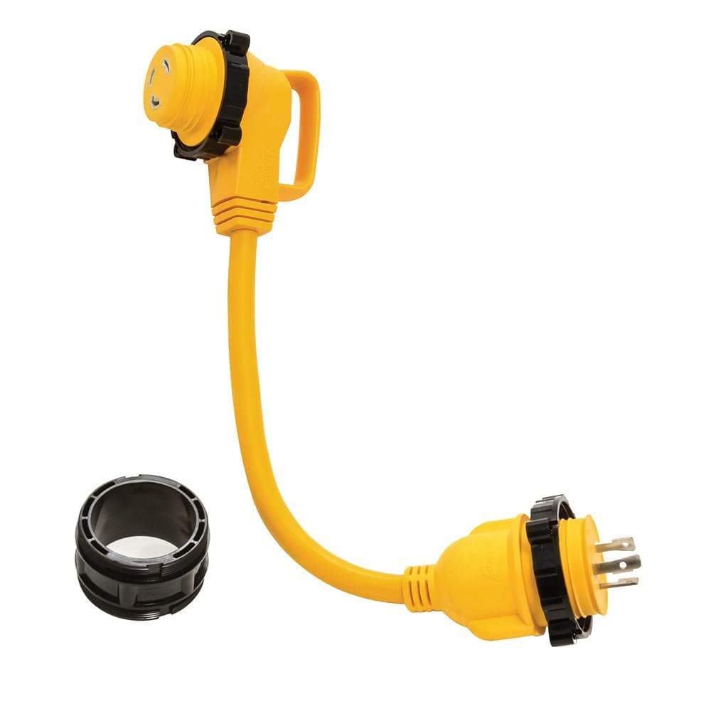 The Camco 30M/30F AMP Locking Adapter is an 18" adapter cord with a threaded locking ring that creates a weatherproof connection. The durable, long-lasting STW cord and 90 degree turn from male to female end to reduce stress help create a long lasting and durable cord.