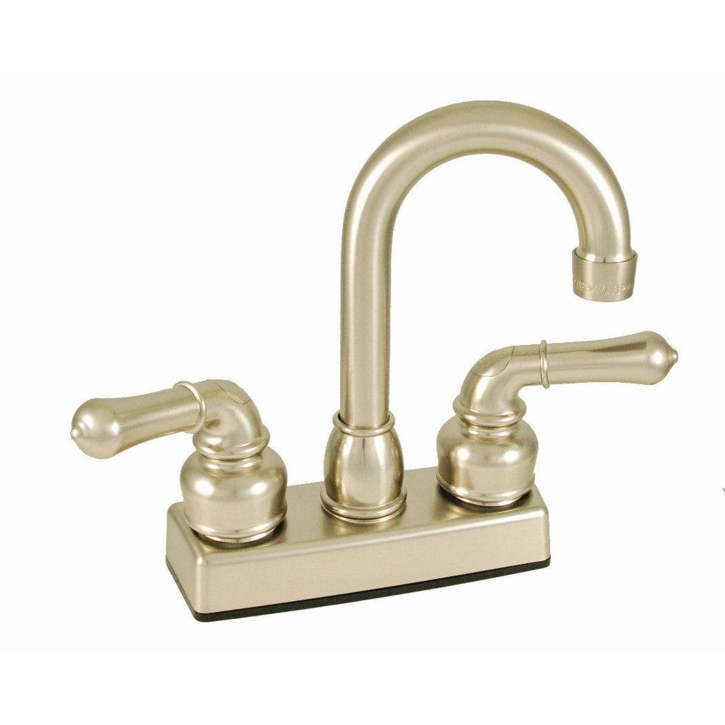 Empire Brass' U-YNN16N RV Home Bar Faucet fits all standard bar sinks. Features a 4" wide base and a 6-3/4" tall gooseneck-style spout. The gooseneck-style spout provides high clearance to allow for deep pots and large pans. Faucet features classic roman-style teapot handles. This faucet features a warm brushed nickel finish for an upgraded, clean look. Designed for installation on a standard 2-hole sink.
