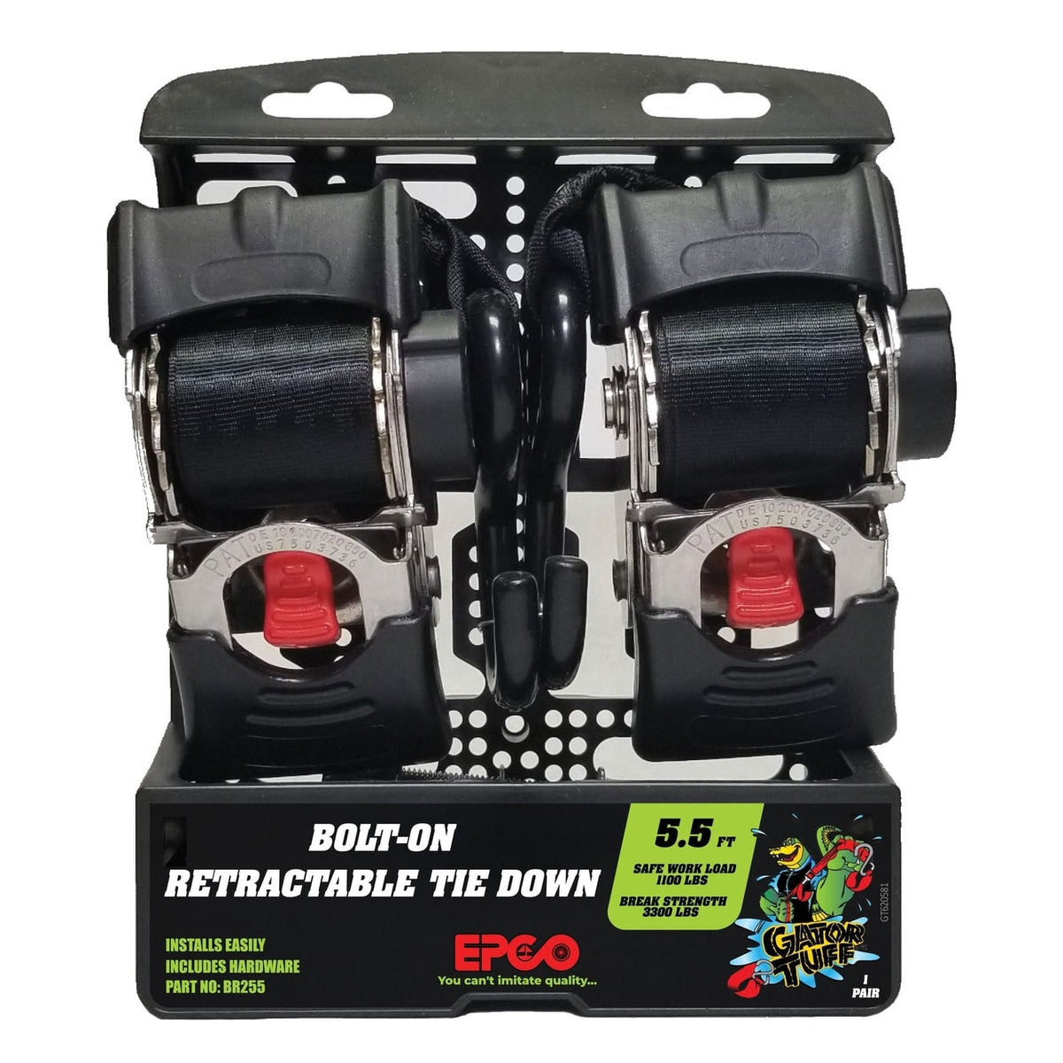 Gator Tuff's Bolt-On Retractable Tie Downs permanently mount to your trailer with included mounting bolts. Each tie down features an easy lift release, rubber grip handle, and a spool mode that works at your command! Includes two tie downs. Working Load Limit: 600 lbs. Break Strength: 1800 lbs.