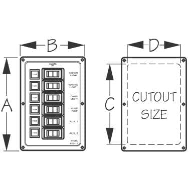 Aluminum Vertical Rocker Switch Panel features six 15A 12VDC illuminated SPST On/Off rocker switches and six 10A 12VDC fuse holders. Individual circuit 10A max. 37A total. 12VDC. Includes a sheet of 20 preprinted decals to customize to your specific applications. Constructed of stamped anodized aluminum. Installs with six #6 RH fasteners (not included).