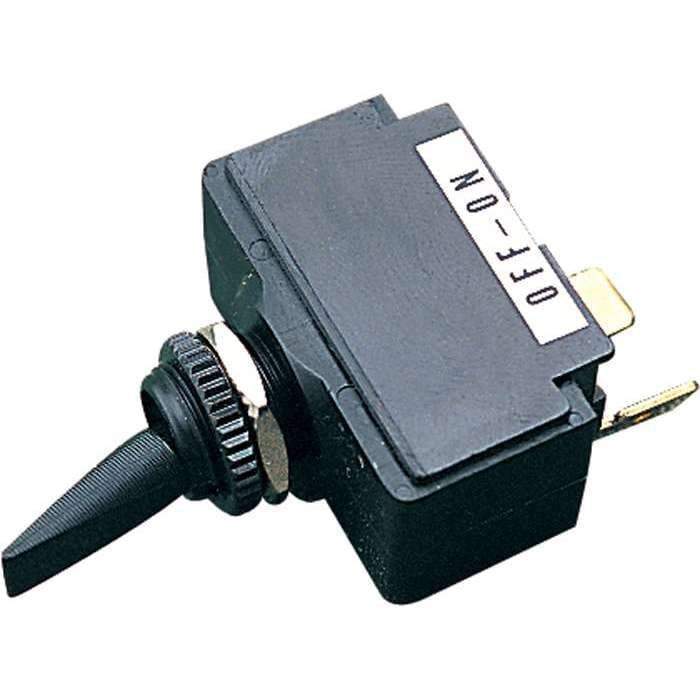 Water resistant Toggle Switches feature a locking ring with lever seal and a protruding cap nut. Easy to install for a variety of applications. Constructed of stamped brass, injection molded nylon, and polycarbonate. 15A @ 12VDC.