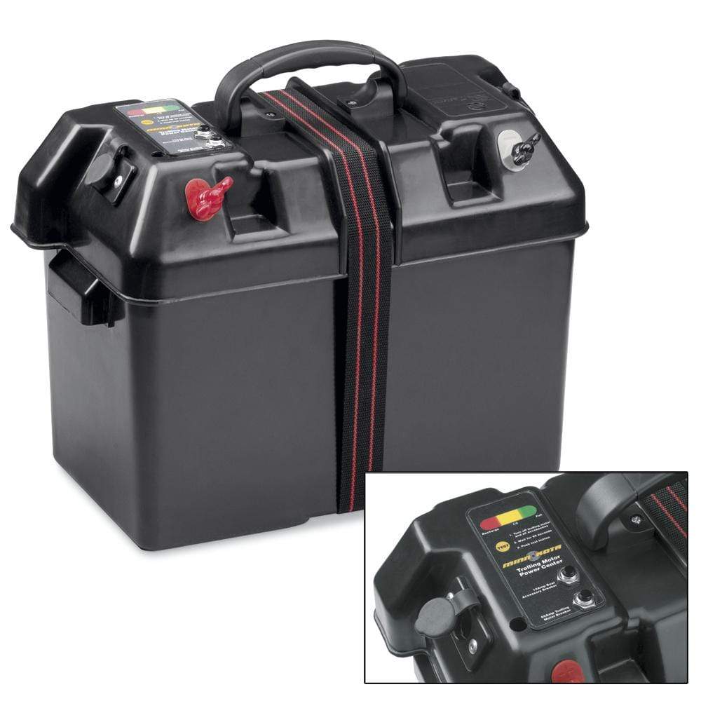 Ideal for small boat, transom applications (boats that do not have battery compartments), this power center features easy-access external battery terminals that allow trolling motor leads and charger leads to be connected without opening the box. A built-in battery meter displays current "state of charge." Fits group 24- and 27-size batteries.