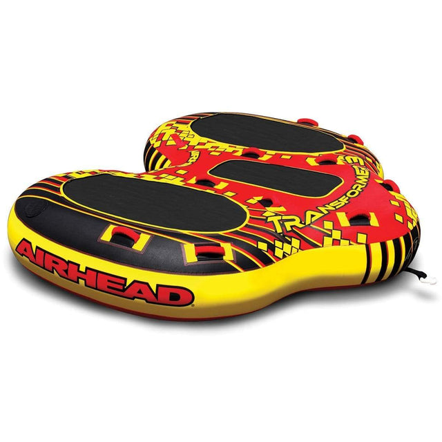 Transformer 3 Triple Riding TubeAIRHEAD TRANSFORMER is 3 tubes in one! Designed for 1 to 3, ride it deck-deck-deck, cockpit-deck-cockpit or cockpit-deck-deck! The center rider lies down, deck tube style. The outside riders can choose to also ride lying on the soft comfortable pads. Simply remove the inflatable inserts and roll up the deck pads in seconds and transform it into a recumbent cockpit! Young children will especially enjoy the safety and security of cockpit mode. The inflated floors and deluxe handles with neoprene knuckle guards will help them feel safe and secure. Teens and adults normally prefer a wilder deck tube ride. Transformer 3 is built to last, with rugged double-stitched 840 denier nylon and 30 gauge vinyl bladders. The heavy duty Kwik-Connect and patented Speed Safety Valve provide quick and easy rope hook-ups, inflating and deflating. 112" x 92" (deflated size).