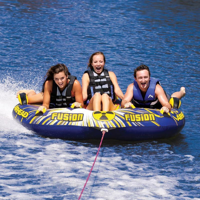 AIRHEAD® FUSION™Cockpit-style towables are great for small children because they feel secure sitting inside. Teenagers love the wild ride of a deck tube. AIRHEAD FUSION is a revolutionary new tube design, it's both a cockpit tube and a deck tube! The roomy center cockpit is equipped with a nylon covered inflatable floor and headrest. The side deck areas have