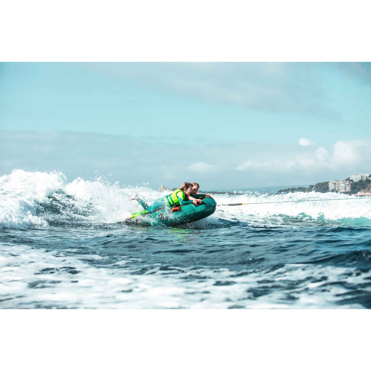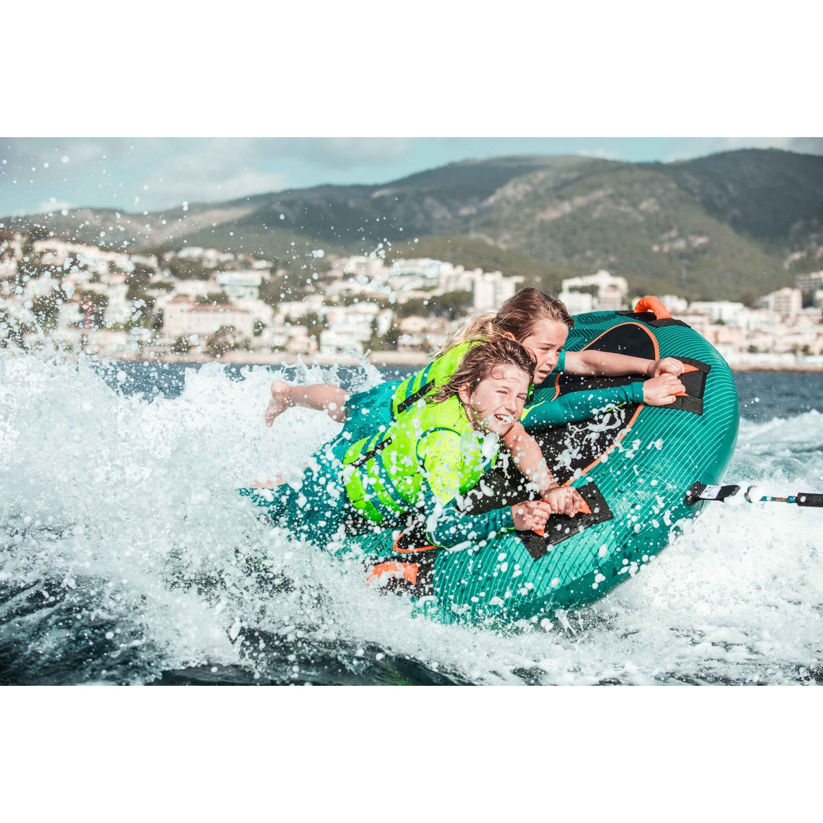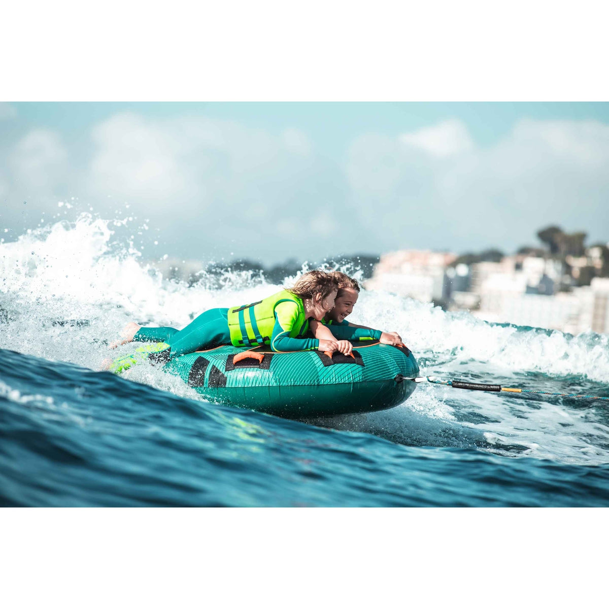 Droplet Towable Tube, 1-RiderFeeling hot? This Droplet can cool down one happy rider in no time! The Droplet is fully covered with double-stitched nylon over heavy duty PVC bladders. A convenient quick-rope connector allows easy rope connection and detachment. You'll appreciate the convenience of the 4 handles with comfy neoprene knuckle guard and the fastness of it's one way boston valve.