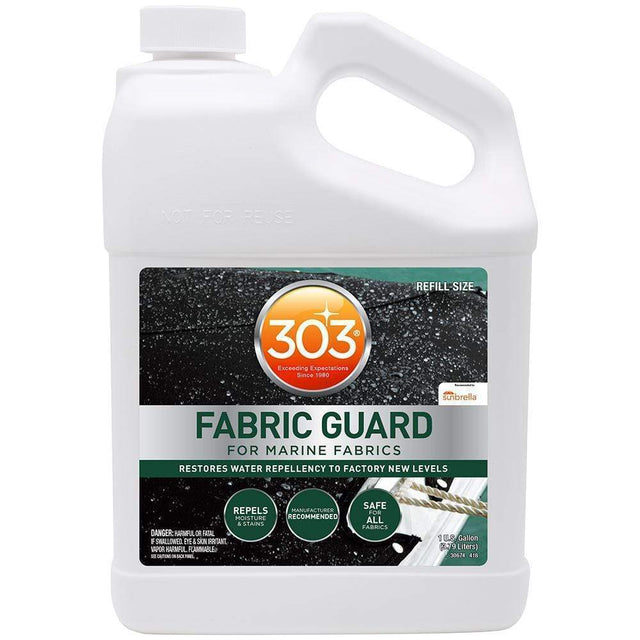 303 Fabric Guard is the only product recommended by and for Sunbrella, as well as other fabric manufacturers to restore lost water repellency to fabrics. Resist water, even when you’re on the water. 303 Fabric Guard creates a powerful shield to greatly increase repellency and protect against oil and water- based stains. Spray it on outdoor leather seats, boat covers, awnings, Dacron sails and more! When applied to clean and dry fabrics, 303 Fabric Guard restores lost water and stain repellency to straight-from-the-factory levels. Keep all your favorite fabrics crisp and clean for years to come.