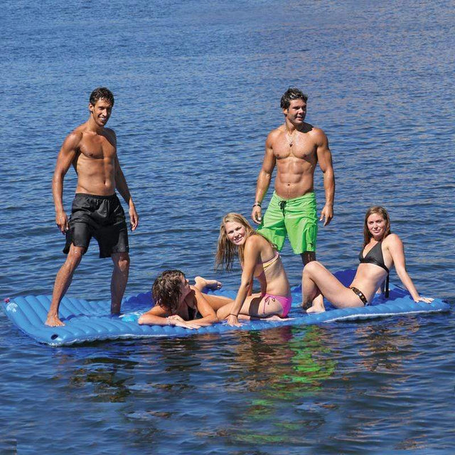 AIRHEAD GANG PLANK Inflatable MatWalk on water with the amazing AIRHEAD GANG PLANK! Up to 6 people can walk the plank, or better yet, relax, and play on the inflatable mat all day long. The innovative design features a zippered connection system so you can link as many together as you want, for the ultimate party on the water! Constructed of tough 30 gauge PVC with 4 grommets to tether it to the lake bottom, your boat, dock or the shore. Featuring a reversible color scheme, the regal white side or opposite royal blue side will surely match your lake house or pool. Lounge with your friends in air cushioned comfort or get wild on Gang Plank.