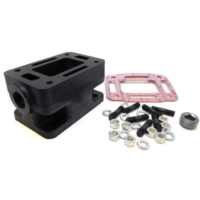 Exhaust riser for Barr generic center-rise manifolds mounts between the manifold & elbow to reduce the possibility of water backflow into the engine through the exhaust.