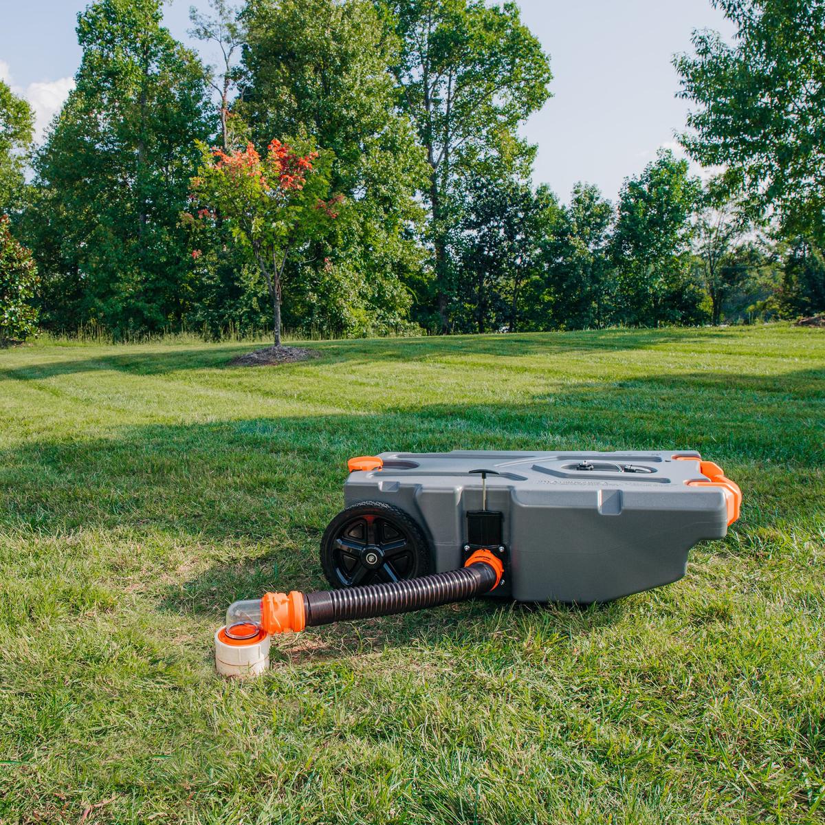 The portable waste holding tank is constructed of extremely durable blow-molded, UV-stabilized HDPE that won't leak or deteriorate in the sun. The ready-to-use kit includes everything needed to transport waste from your RV or trailer to a dump station when you’re parked too far away for an RV sewer hose. The kit includes accessories to clean, maintain, and store the tote tank when not in use. Large, heavy-duty, no-flat wheels with bearings make transporting the tow tank smooth and effortless. The removable steel tow adapter allows you to easily roll the tote tank as you would with a suitcase or luggage. You can also transport it by towing it slowly behind a golf cart or truck.