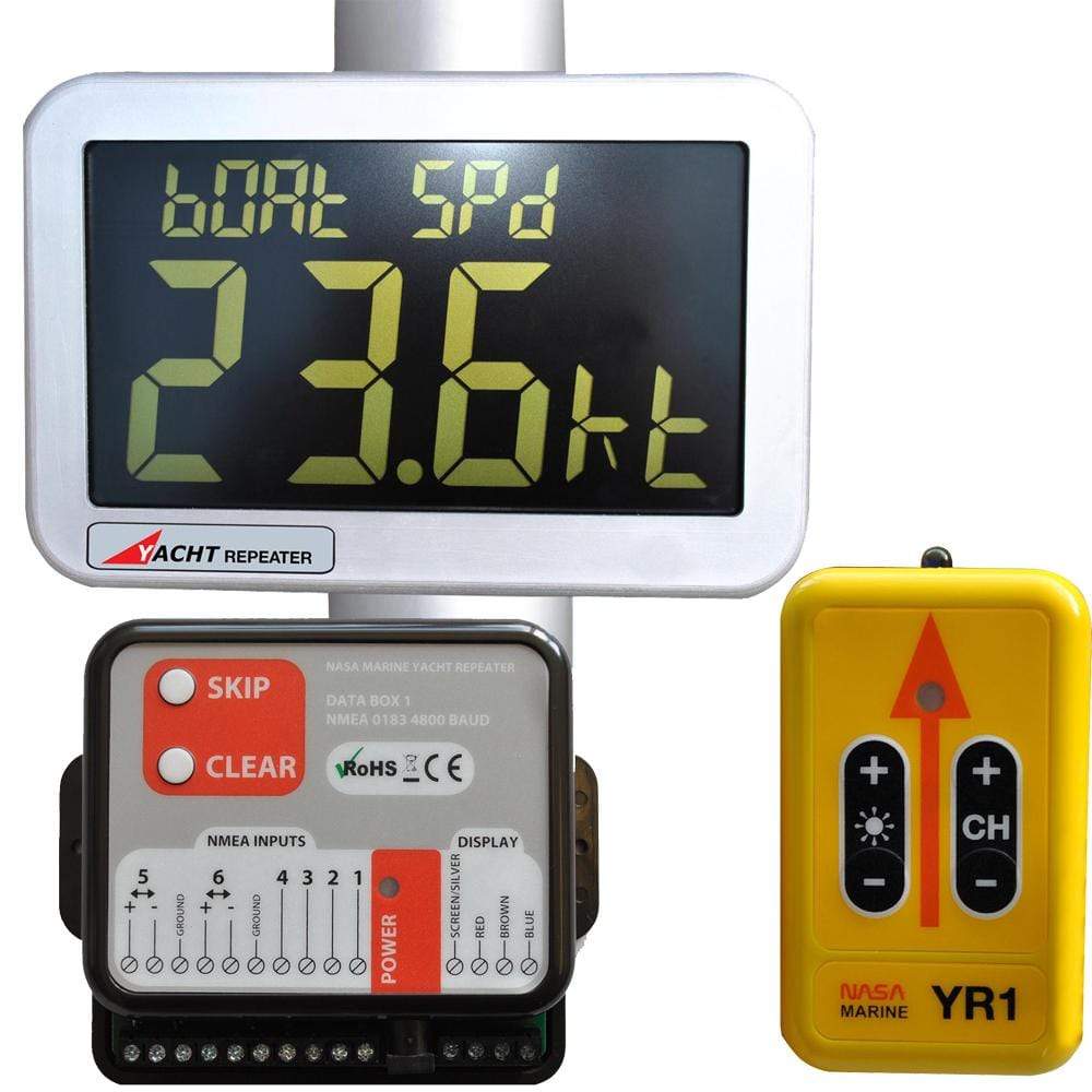 Yacht RepeaterA large display, mast mounted, multifunction repeater is now being produced at our factory. The weatherproof repeater with its 60mm high numerals, is supplied complete with cables, data-box with six NMEA-0183 inputs (With up to three sentences per input), wireless remote control, stainless steel mounting brackets and weather cover. There are nine levels of red back lighting which permit easy night viewing of red characters on a black background.