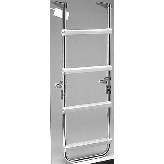 Attaches easily to deck mounted stainless steel Shur-Loc catches (Model 76000) provided. Ladder gudgeon and standoffs fold up for compact stowage. Strap locks ladder in folded up position. Durable 1" diameter aluminum tubing with comfortable and sturdy white, 15" wide traction molded plastic steps. All aluminum standoffs with cushioned tips fold out and abut pontoon "log". Folds from 2 to 4 Steps, Opens to 42".Garelick 2-4 Step Pontoon Ladder #12150