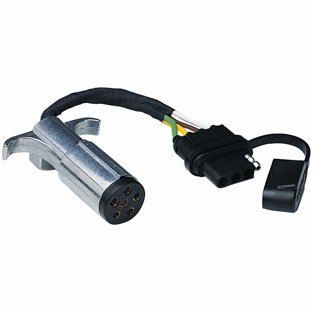 6-Round to 4-Flat eliminates the need to rewire your trailer or tow vehicle. The 6-Round side is constructed from die-cast zinc for durability. Flexible wires increase options for installation. Includes dust cover.