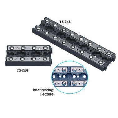 - Interlocking bases allow use of multiple terminal strips and bus bars (described below) to produce secure and neat wiring assemblies. The terminal strip bases have provisions for either #8 or #10 mounting screws, and no conductive parts in the base are exposed to the mounting surface.