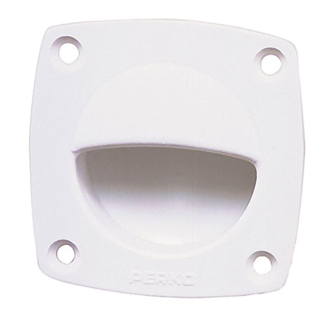 Perko's white polymer flush pull. Specifications include Face plate dimensions 2-1/4" x 2-1/4", depth 15/16", and screw size 6. Installs in a 1-3/4" diameter hole. Sold per each.