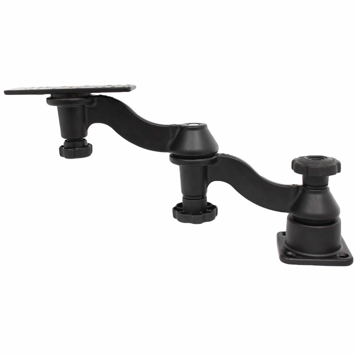 Two 6" long bent swing arms mounted on a horizontal surface mounting base 6.25" x 2" top base 360° rotation A. Overall length: 16.69" B. Overall height: 8.577" C. Height from bottom of base to top of knob: 4.89"