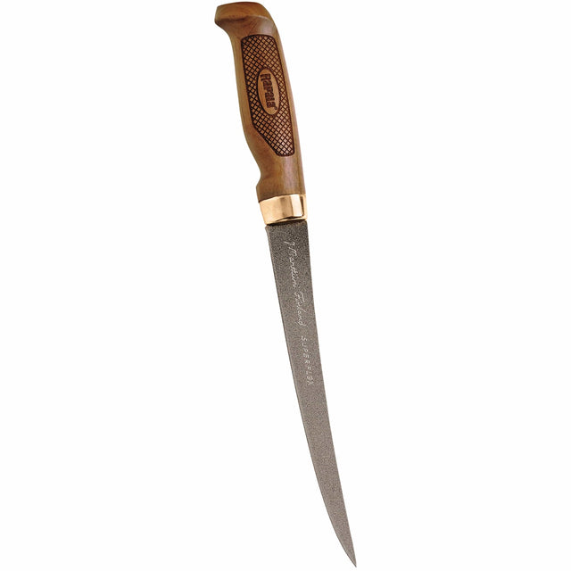 The incredible extra thin blade allows for greatest flexibility and control ever. PTFE non-stick coating makes filleting even easier. Razor-sharp hand ground stainless steel blade features through tang construction that equals maximum strength and stability when cutting. Finished with a polished brass ferrule. Tooled genuine leather sheath has structured scabbard for safe knife storage. Actual blade length may vary slightly due to hand craftsmanship.