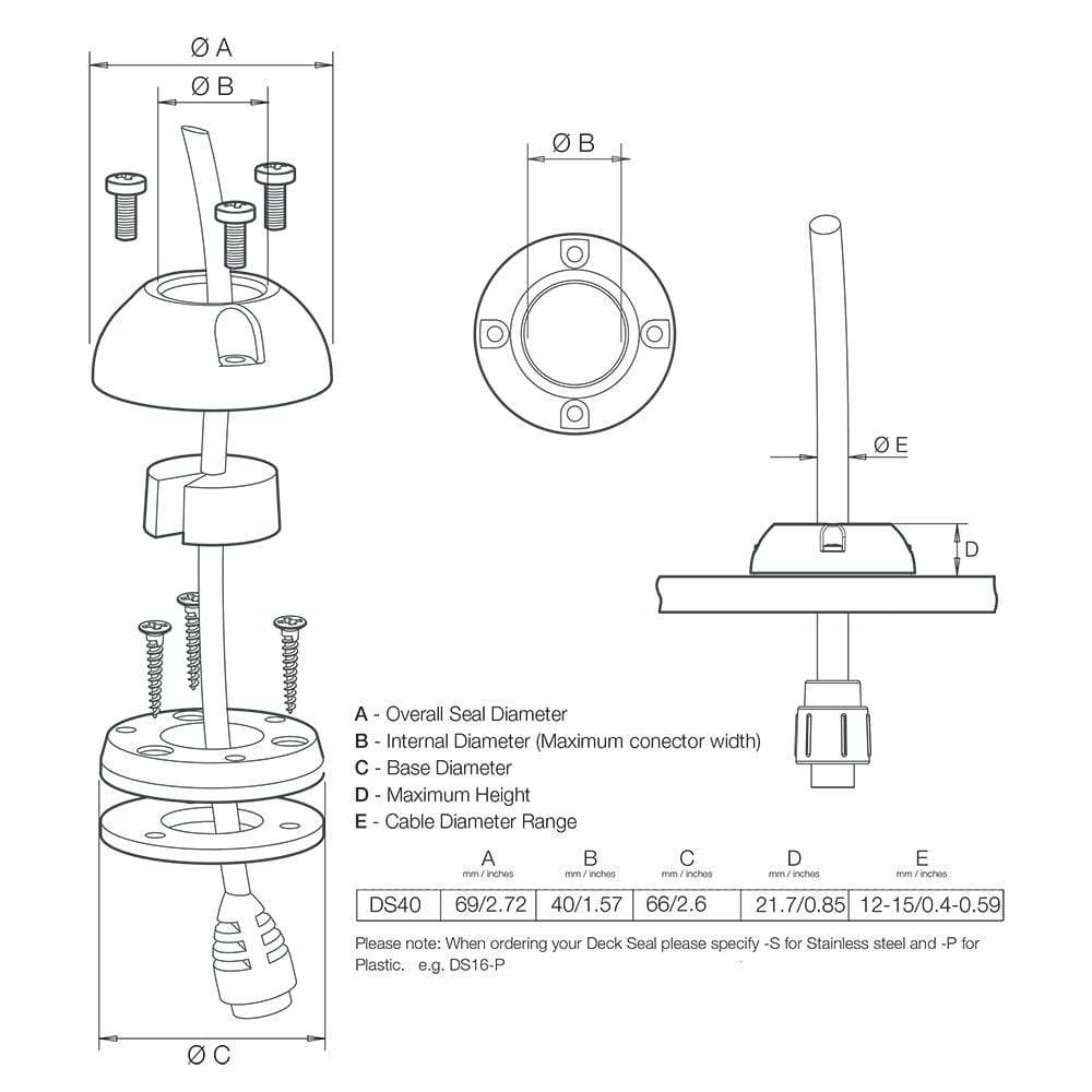 New Large Deck Seal - For connectors up to 40mm (1.57"). Cables from 12-15mm (0.47"-0.59"). Complete kit including fixings and seals.Material: Stainless Steel