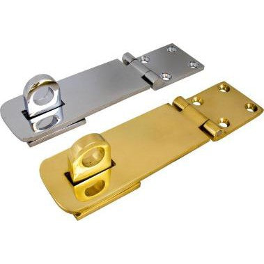 These Heavy Duty Hasps are designed with a slotted plate that fits over a fixed post. Prevents removal when used in conjunction with a padlock. Ideal for use on doors, cabinets, chests, and lockers. Constructed of sand cast brass with a plain polished or chrome plated finish. Installs with eight #8 FH fasteners (not included).
