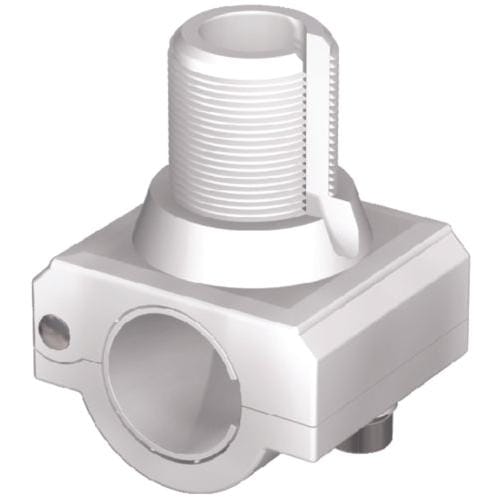 Standard 1 - 14 thread. Attaches to 7/8" and 1" horizontal rails. White nylon construction. Slot on side for threads for cable pass through. Designed for quick and easy installation on vertical or horizontal, straight or angled rails.