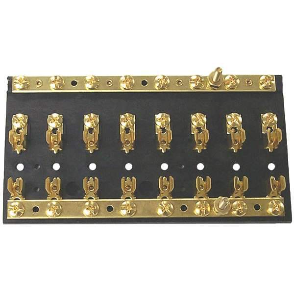 Heavy-duty, black molded plastic base. Use with SFE or AGC fuses up to 20 amps. Brass fuse clips, 8-32 terminal screws. Common bus bar connects hot side of fuses for power feed. Separate bus bar provided for ground or unfused common hot feed. Bus bars have 8-32 screw terminals & stud terminals for power/ground main connections.Sierra Fuse Block #FS40570-1