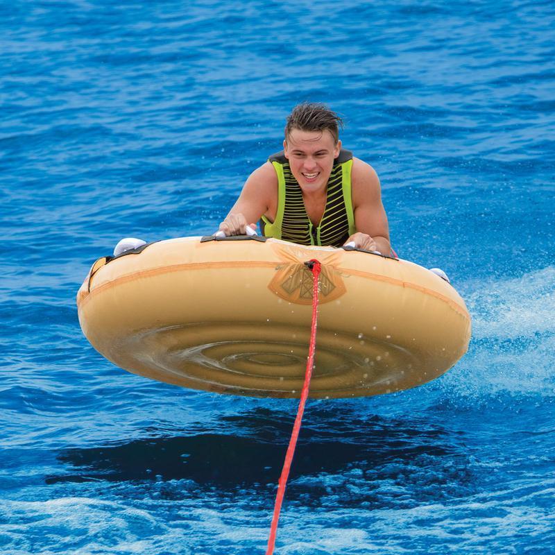 PIZZA has 4 deluxe handles with neoprene knuckle guards and is equipped with a Speed Safety Valve for quick inflating and deflating. Designed for 1 adult or 2 children.