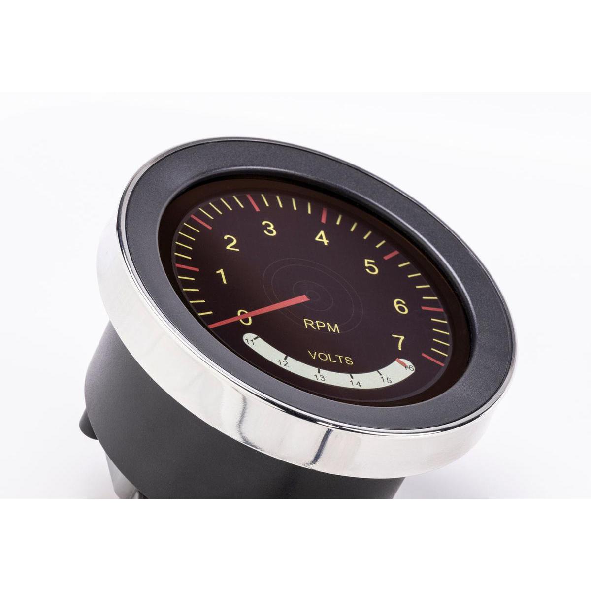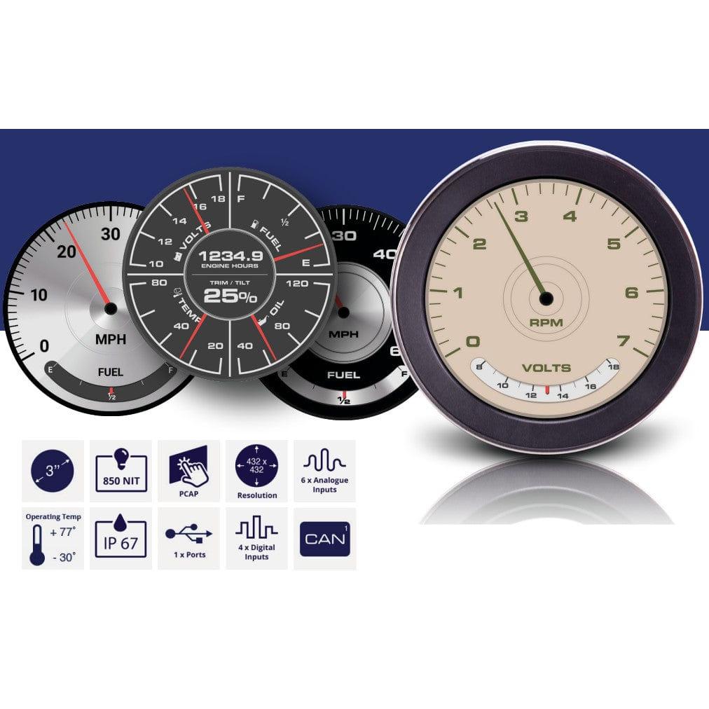 For use with digital or analog engines. Direct fit for most 3-3/8” cutouts. Fully round, edge-to-edge LCD-color display; Customizable screen with capacitive touch abilities, providing the styling of a traditional analog gauge with the modern ability to change looks to suit any application.
