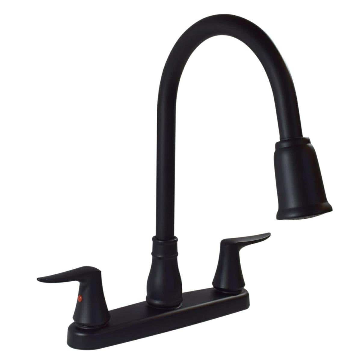 Catalina 2-Handle Pull Down Kitchen Faucet, Matte Black. One piece spin welded POM underbody and shanks. 1/4 turn washerless valve. 3 hole configuration. Single function spray, 1.8 GPM. Advanced quick return for smooth retraction.