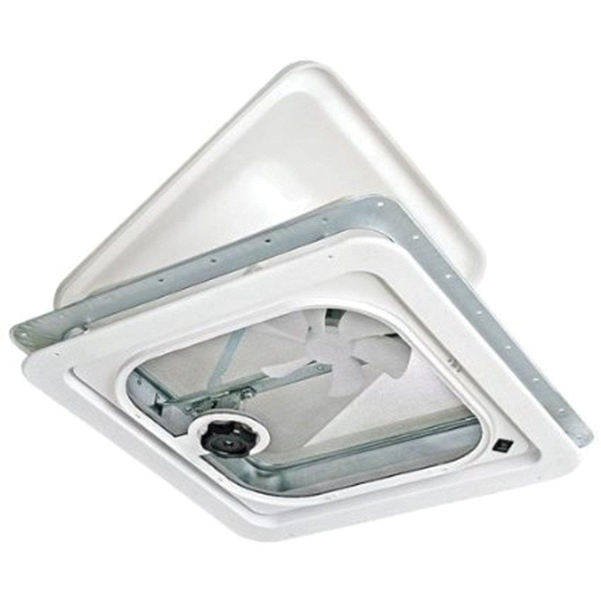 New aerodynamically shaped dome is more durable. Improved lift mechanism provides a smooth operation. New pop out screen detaches for easy cleaning. Available in standard non-powered and 12V models. Fits industry standard 14-1/4" x 14-1/4" rough opening. Includes garnish with an attractive white finish.
